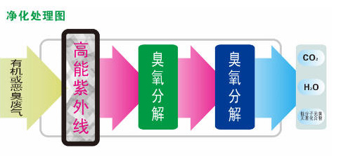 UV光解利用特制的高能高臭氧UV紫外線光束照射惡臭氣體,改變惡臭氣體的分子鏈結構,使有機或無機高分子惡臭化合物分子鏈,在高能紫外線光束照射下,降解轉變成低分子化合物,如CO2、H2O等